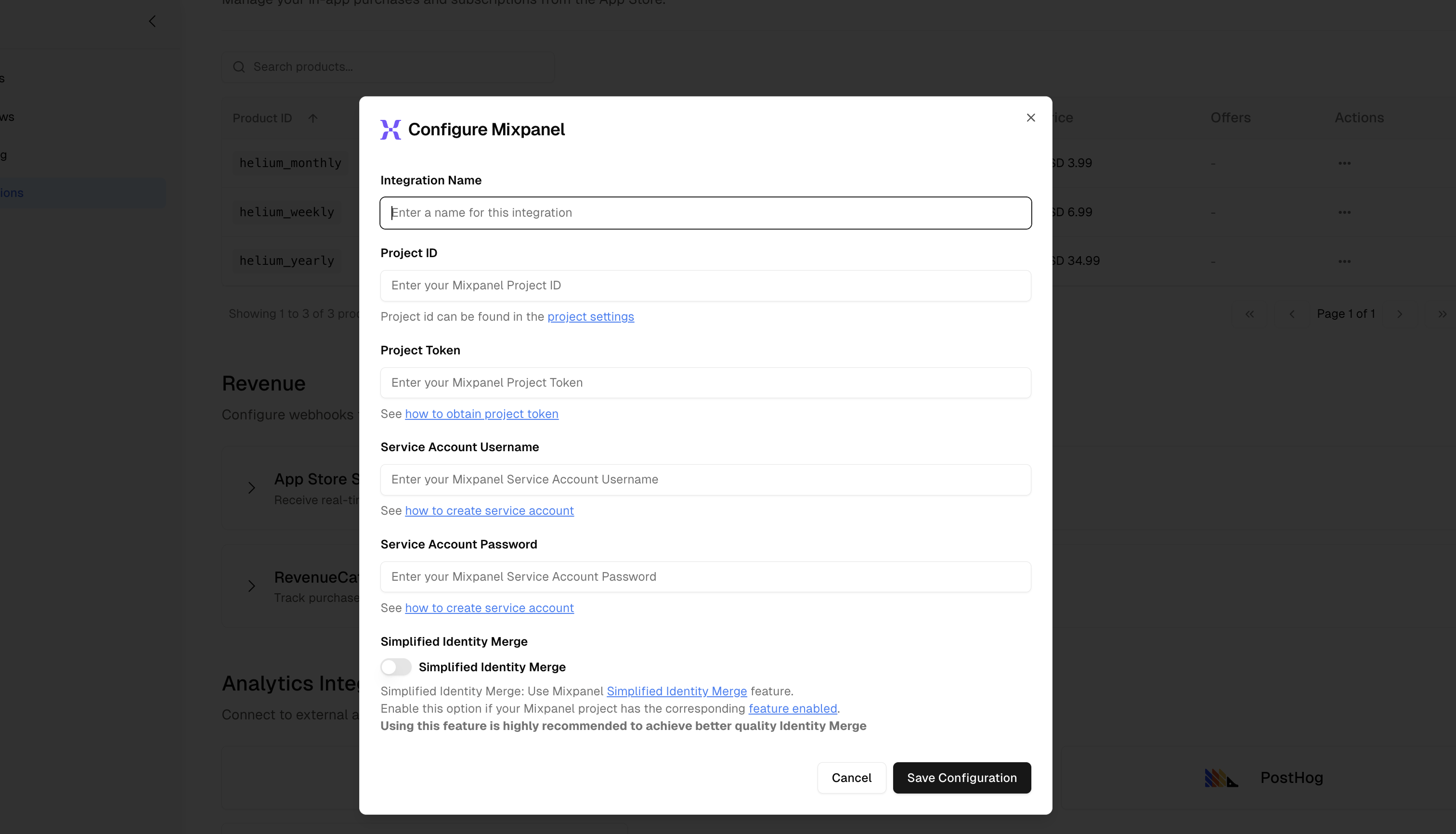 - Go to app.tryhelium.com/integrations. Click Mixpanel.